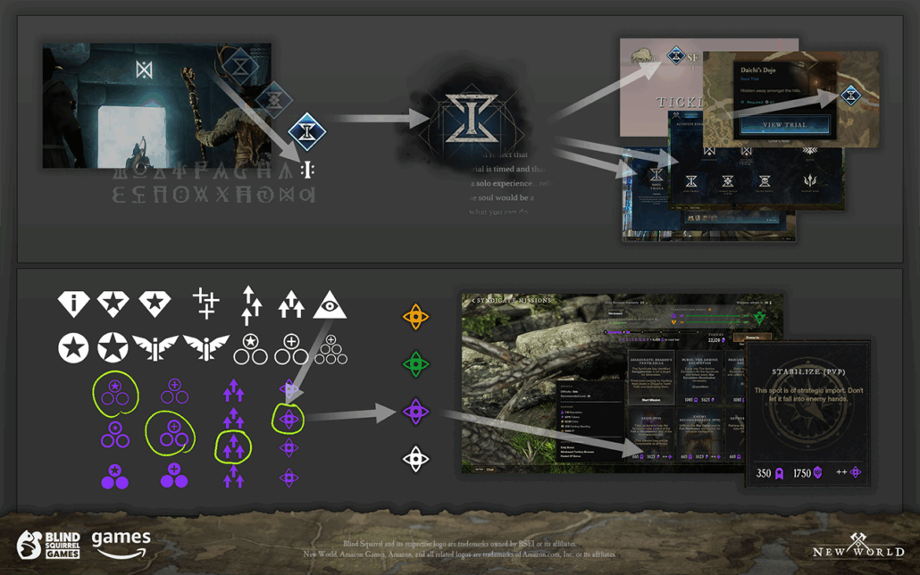 TOP: TOP: “Make all Soul Trials Assets.” The previously designed Trials and Season Trials icons were based on a rune shown above the entrances to those trials – this solution for “Soul” or “solo” trial icon is sand in the overall hourglass shape… resembling a Roman numeral one, (simultaneously driving home both “timed” and “solo”) but also “I” as a word.